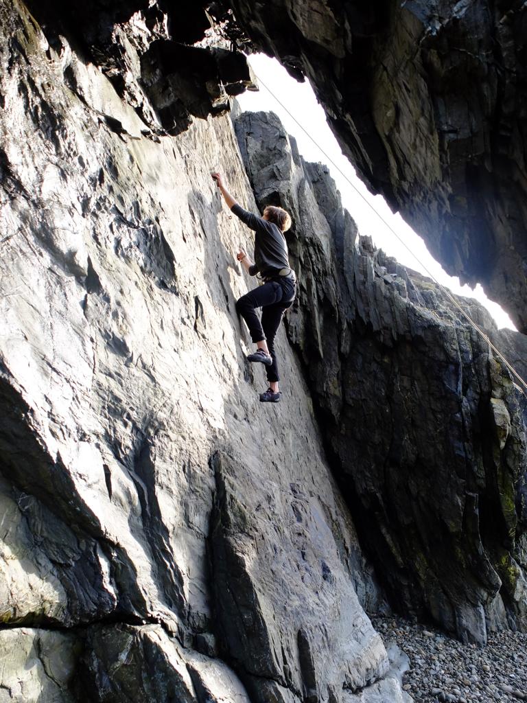 Also known as Allens’s Sunbeach this is the large caravan park just south of LLwyngwril with a long pebble beach leading to a small sea cliff 400 metres south of the park. Access by parking on the beach but be aware the gates lock at 6pm . If staying later park just outside the gate. This is all private land for parking but to date the park has been very good at allowing visitors whether climbers or not.