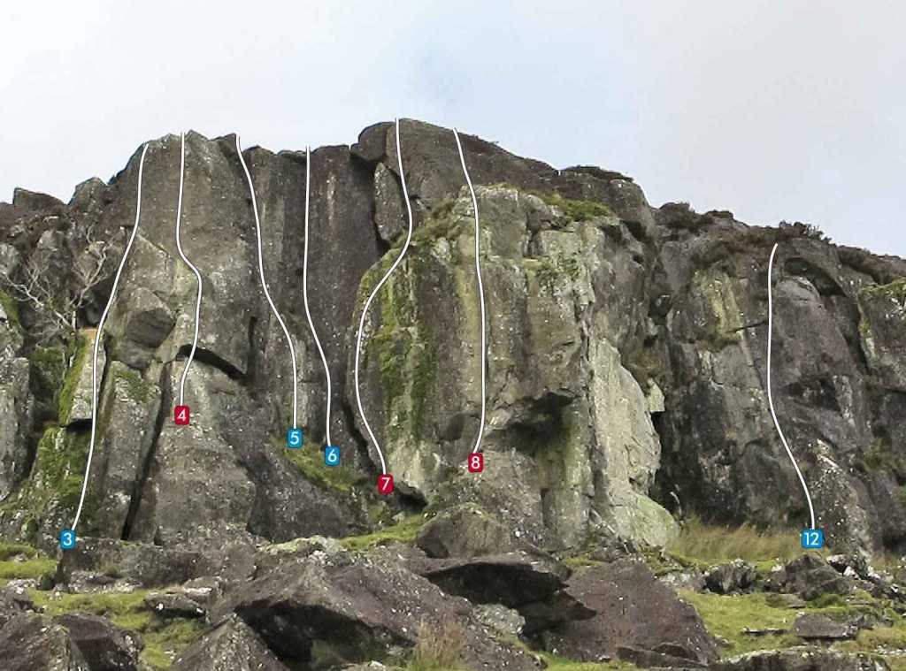 This neat crag also sits on the hillside north of the Dolgellau-Bala road and is reached from Llanuwchllyn. There is a small buttress over on the left then the main section above a boulder field, and a terraced buttress on the right. These 3 routes are on the central section.