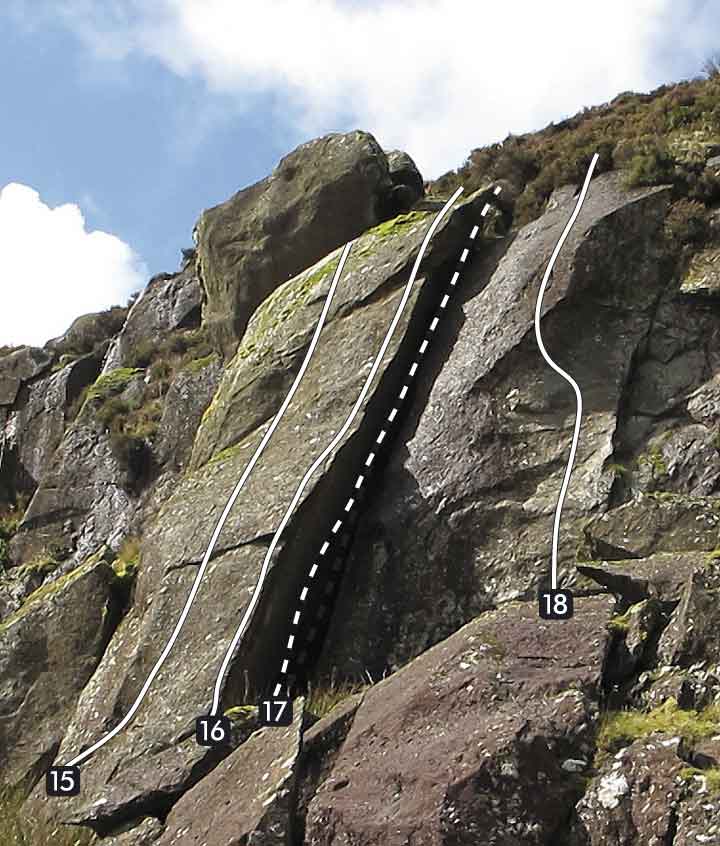 The right edge of the leaning wall gives perfect climbing with excellent but spaced holds. Start in the recess just right of the edge and step left onto the edge. Pass directly up to the horizontal break, wonderful pocket above. The deep, vertical pocket 2 metres above this is a sinker once gained , and after pulling up rightwards the heathery top is touched. Pre-placed lower off a good idea.